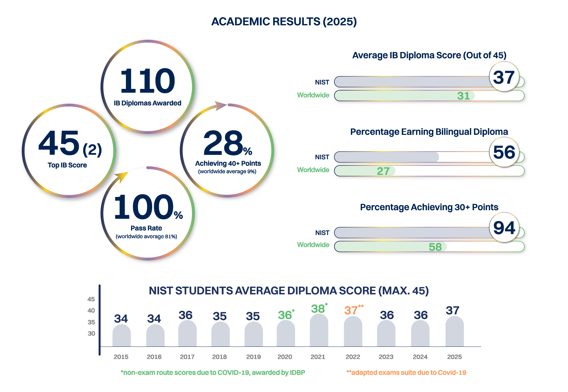 The Class of 2025 achieved outstanding IB results, with two students earning a perfect score of 45, an impressive class average of 37, and 27% of the cohort achieving 40 points or higher. Over half of the graduates (56%) earned the prestigious Bilingual IB Diploma, and the class achieved a 100% pass rate for the second consecutive year. These results reflect the dedication, resilience, and collaborative spirit of the students, teachers, and families that make up the NIST community.