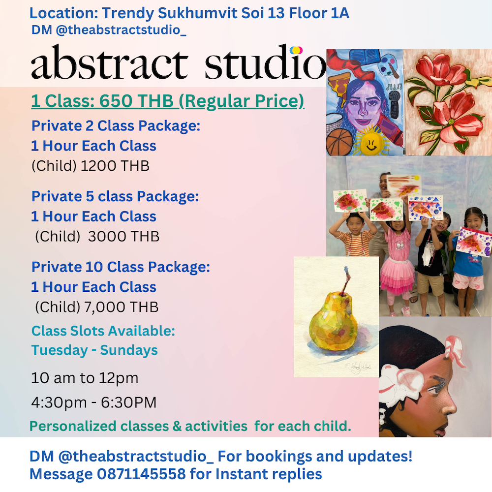 Abstract Studio, Abstract Studio, founded by Dhiksha Sajnani, offers private one-on-one art classes for children aged 6 to 10, ensuring a personalized and immersive creative experience. Each lesson is tailored to the individual student, allowing them to explore different artistic styles, develop their skills, and build confidence at their own pace. Abstract Studio is the perfect space for young artists to express themselves and grow creatively.