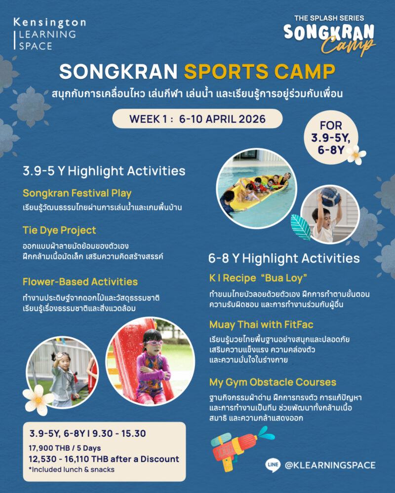 A Songkran-themed sports camp where children will enjoy tie-dye activities, flower-based art, making traditional Bua Loy, learning Muay Thai with FitFac, and having fun with My Gym obstacle courses.