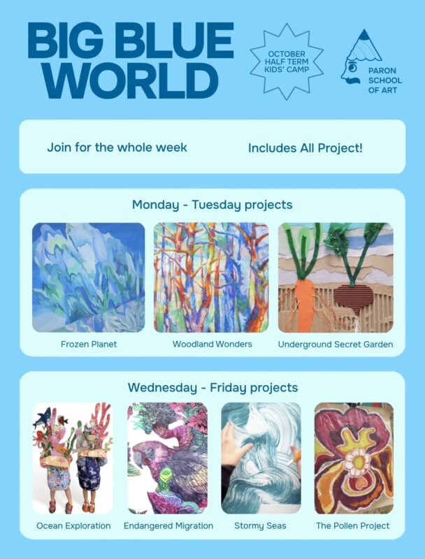 From icy polar lands to hidden gardens underground, each day opens the door to a new world. Young artists will travel from colourful coral reefs to roaring seas as they bring their ideas to life through painting, sculpture and design.